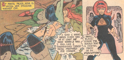 "City in the Sand" is a sixteen-page story with much to recommend it. The splash page is a treat, as it is the first time we have actually gotten a glimpse of one of Nova's performances. The humorous touches continue, with signs all over the lost city urging Naabians to join the "Great War Machine."