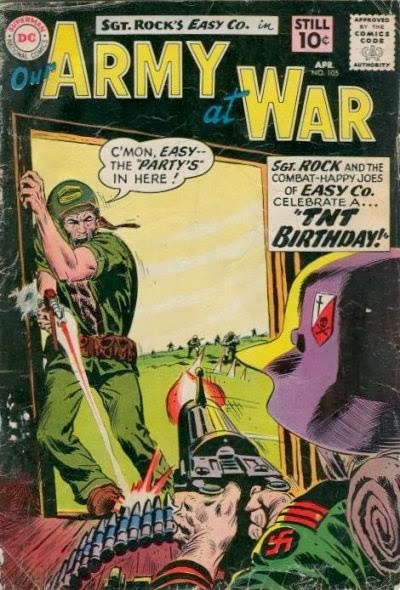 Jack: In "T.N.T. Birthday," Sgt. Rock blows a gasket when new private William West reports for duty, looking even younger than his claimed age of seventeen. Before Rock can send the boy back, however, Easy Co. is attacked by Nazi shelling and must take cover in the woods. There, they destroy an enemy tank and then hide in a foxhole, where only some quick work by the new private keeps them from being blown to bits by a well-thrown potato masher. That night, the private leads Easy Co. in a bold stand against enemy attack, finally earning his right to stay with Rock's unit the next morning when he proudly demonstrates his first chin whisker!