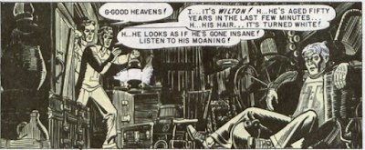 WF didn’t exactly get off to an auspicious debut with a story called “Am I Man Or Machine?” written and drawn by Al Feldstein (with a little co-authoring by Gaines), inspired by the disembodied brain stories that were the rage at the time (Curt Siodmak’s novel Donovan's Brain being the most famous example). Roger Harvey shows up at the door of his fiance Diane, who’s a little shocked to see him since he was killed in a car crash two years before. Roger explains that, though his body was killed in the accident, his brain was kept alive by two brilliant scientists in a jar of liquid.  With amazing technologies, the two doctors manage to create a plastic body for Harvey’s brain (one that is, amazingly, so lifelike no one notices Harvey looks like a life-size G.I. Joe doll) and teach him how to use it. When Roger finishes his story, Diane sighs and admits that two years was a long wait and she went off looking for love elsewhere. Though she’s married, she offers to dump her husband and run away with Roger. Realizing that he can’t give her the love she’ll need, he instead tells Diane that the whole story was an initiation prank and, one would think, heads off to find a window mannequin he can call his own. Of course, my warped brain wants to see the alternate ending where Roger takes Diane up on her offer and shows her just what this plastic body can do!