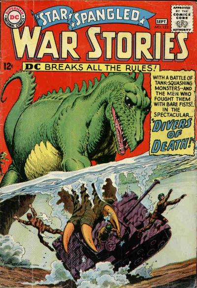 Peter: Quadruplets Jim, Jake, Jinx, and Jess join the services during World War II. Jess and Jinx become frogmen while Jim and Jake are assigned to a tank squad. The four meet up when they're all scheduled to take the same beach but obstacles from the stone age keep them from achieving their goals time and again. There's nothing new story-wise with "Divers of Death," as we learn yet again that brothers not only made up the bulk of our fighting forces but, chances are good, they'd somehow be fighting on the same beach or in the same air space. Bob seems to have put the Suicide Squad to the side for this issue (as well as the notion that the Pacific Dinosaur Region is known to the Army) to fall back on the "brothers-in-arms" boilerplate and the results are trite. What's new (and far from trite) is the artist on The War That Time Forgot this issue. Though there have been 32 installments of WTTF, only one team has been responsible for the art and that's Andru and Esposito. Russ Heath steps in and does a bang-up job, creating what looks to be a cross between a T. Rex and Godzilla and a giant underwater spider. Who cares if these things probably never existed in the stone age; we're the better for Heath's imagination. Russ will contribute to WTTF five more times before its cancellation in 1968. Next issue: a guest stint from Gene Colan. Does it get any better than this?