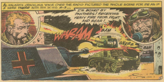 A tank crew can't seem to get to where they're supposed to, no matter where they start from, and the C.O.'s always blasting an infernal "Tankers!--Where's Your Tank?" over the radio. Determined to get it right this time, the squad heads inland but runs into trouble when the bridge they're crossing is bombed by a Zero and the tank ends up floating out to sea. There they drift squarely into the cross hairs of the enemy but manage to beat the odds to live another day. Now all they have to do is shut that C.O. up. Hank Chapman's stories usually get on my nerves as, usually, we're fed the same three or four plots, but "Tankers!..." is good fun with nice Jack Abel art. Yep, it's a bit far-fetched (as usual, the enemy can't seem to hit the side of a barn door) but, hey, at least the crew isn't made up of triplets!