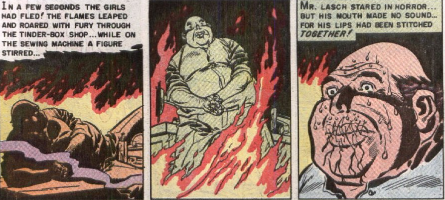 Speaking of villains, few in the EC repertoire come any more one-note than the despicable Mr. Lasch of “A Stitch in Time!” The burly, cigar-chomping (natch) slave-driver of an early-century sewing mill is completely merciless and without an ounce of nuance to be found in his 300 lb. bulk. He maintains a vocal level no lower than screaming, he considers anything not involving sewing to be a waste of the company’s time up to and including breathing that he hasn’t given the OK on, and he thinks nothing of driving one old biddy out of her gourd when he assigns her to sort out scraps of thread after she’s injured her hand on faulty equipment before finally driving the mumbling broad out into the street where she’s run over by a hapless driver. Suffice to say, the other nine ladies under his employ don’t take kindly to this and show the boss their appreciation by sewing his lips and hands together and then leaving him to die in a fire.