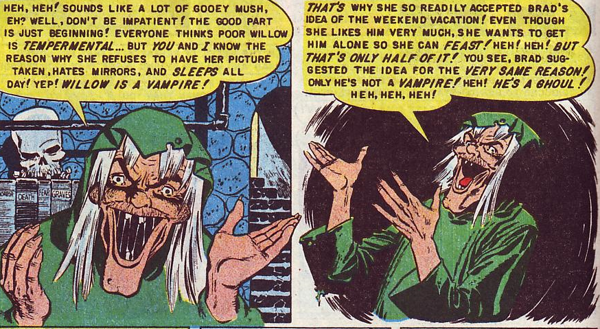 was EC; it’s his voice that we identify with so many cackling puns and shock endings. I think my growing affection for him has resulted in an increased enjoyment of each story, regardless of its status as classic or turkey. By my estimation, there aren’t any turkeys in the barnyard that is