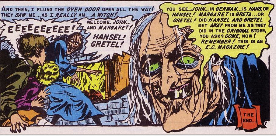“Sugar ‘N Spice ‘N…” might be a bit of a misfire in certain regards, but you can’t deny the irrepressible chill that comes with Feldstein’s gradual mounting of suspense as he reveals who (and what) the real monster is in this story. Here the Horror SuspenStory eschews opening narration from our lass from the Haunt of Fear in favor of closing words provided by a different Old Witch, one a hell of a lot more terrifying than our favorite lady GhouLunatic was ever depicted. The crone breaks the fourth wall to essentially tell us that she just enjoyed a nice meal of roast babe, but her reasoning for targeting these two tots based on the German derivatives of their names (Hansel and Gretel for those keeping score) seems kind of funny in retrospect. Is she bound by some infernal magic to only gobble up brats that have those two names?