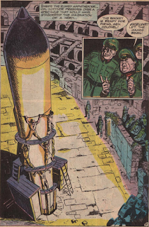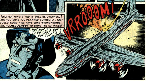 Joe Haines is a free-wheeling playboy stuck in a low-paying accountant’s job. To keep his girlfriend Nickie happy and well-jeweled, he’s been appropriating funds from work. When the boss gets suspicious and voices his concerns, Joe realizes he’s going to have to think up something fast. His salvation comes in the form of a time bomb and a timely business trip. Joe places the bomb in his boss’s luggage just before the man takes off, then drives to the spot in the desert where he’s calculated the crash will occur. Joe gets his expected comeuppance when he becomes part of the crash. "Rendezvous!" is not a great story in terms of the plot and the contrivances needed to pull it off (does Joe really think he could dig through the flaming wreckage to cover up any proof of the bomb?), but it's livened up by what could be one of the most sadistic characters in comics. To cover up his own foolishness, Joe thinks nothing of killing hundreds of lives. It’s also a tough story to read in the wake of 9/11. Back in the 1950s, monsters like Joe Haines populated comic books, not desert training camps and 747s.