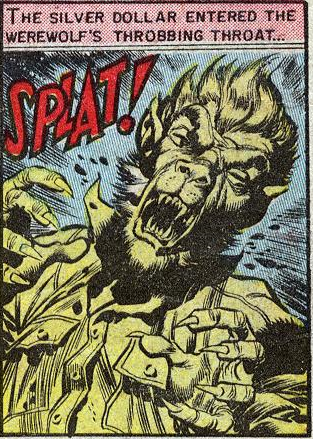 “By the Fright of the Silvery Moon” works best if you try not to think about the developments and machinations of its plot too closely, which is something that I don’t have too much trouble doing anytime there are werewolves in the mix, and especially when they’re drawn by Jack Davis. Due to the murder-mystery trappings of the story we don’t see any signs of our trouser-wearing hellhound until the final page right before the “shocking” conclusion. So I take it that Edward was only allergic to silver in his wolf-form? Otherwise shouldn’t he have broken out into hives during all that silver dollar filing? (Jack can say whatever he likes about that, but I think that two kids going out werewolf huntin’ with nothing but razor-sharp coins and a couple of slingshots is pretty badass.) “By the Fright…” is not quite the perfect lycanthrope story we were hoping for (was there ever one?), but it’s worth it solely for bringing about that ferocious front cover if nothing else.