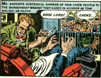 tired! The next day, Tony makes sure his slate is clear and, when Mr. Barker arrives, he gets a very close shave! "Who's Next?" is more of the same from Al's bag of plots, this one using the haggard frame of the poor guy with the adulterous wife who doles out revenge based on his profession (a frame we seem to be seeing quite a lot of). Nothing new here and, in fact, five of the seven pages are given over to nothing but poor Tony wondering why his wife is being so mean to him.