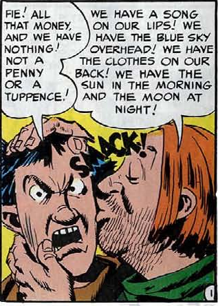 Big John and Sparkie are two pals in Merry Olde England bemoaning their penniless states when they suddenly hit on the idea to seek out that great bastion of the impoverished, “Robin Hood”! The bloke steals from the rich and gives the booty to the poor… Big John and Sparkie are poor… and, well, as Einstein would say, “You do the math!” The bums run into Robin Hood in short order and tell him and his Merry Men about a caravan of well-to-do snobs that just passed through, which they verily loot and pick clean. When our heroic bums bemoan that they only have two cents to their name, Robin and Co. verily loot and pick them clean before going back for the shirt on their backs.