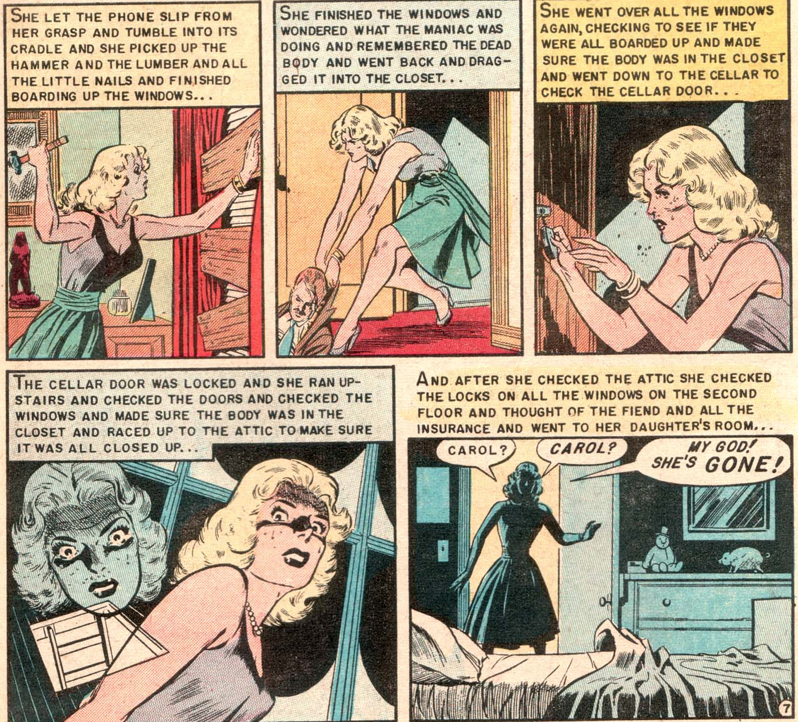 Tales from the Crypt, ". . . And All Through the House . . ." is ghoulish holiday fun. I love how Craig has our nameless heroine calm as a millpond, sparking up her ciggie and coldly sizing up the corpse on her living room rug, but when the shit hits the fan, our girl is racing around doing five things at a time (and not doing any of them all that well!). She begins to hide that body three times but is always interrupted by some other thought. Little Carol's beaming face in the final story panel is a classic. I'm on the fence as to whether Subotsky improved on Craig's story or if they're just about equal (the one thing that the story has over the film is that Craig is able to sustain the dread without actually showing the maniac until the very last panel!). Joan Collins does a fabulous job as the cold, calculated murderess and the suspense keeps you right on the edge of your seat; it's a hard thing for a filmmaker to do when only given about fifteen minutes.