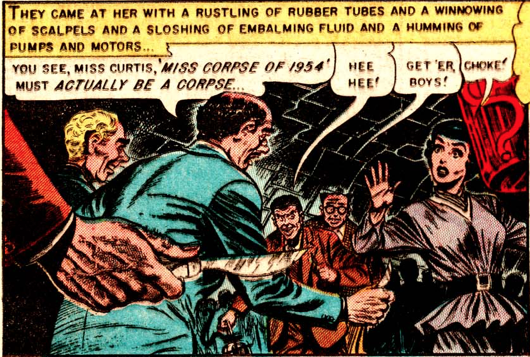 may have given the cold miss a few too many sleeping tablets. Quickly erasing all evidence, she calls the cops and sobs out the story of her best friend's suicide. Shrugging her shoulders and glad she's rid of Joyce, Helen heads to the award ceremony, held in the dank basement of a creepy brownstone. Too late, Helen discovers, as several men emerge from the shadows with gleaming blades, she's actually going to become Miss Corpse of 1954! The ludicrosity factor of "Beauty Rest" is very high, dangerously high. How would these undertakers ever get away with the murder when other women entered the contest? What possible motive would they have for wanting an actual corpse? Are they ghouls or simply maniacs united in one common goal? Too many questions? Maybe. Have I spent too much space pondering this dreadful waste of time? Certainly.