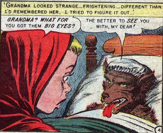 Foxy, red velvet-clad Gwendolyn walks the streets of her fairy tale village hearing the cat calls and wolfish jeers of sexually-starved rubes every day of her life, but she gives everyone a turn when she decides to step out one evening with none other than local doofus Melvin. As she explains it, her admiration for the simpleton stems from a traumatic incident from her childhood when, after receiving her famous scarlet cape from her parents, she traveled to her sickly grandmother’s house with a basketful of jet fuselage and tommy guns only to be waylaid by a ravenous wolf that was quickly gunned down (on the second shot) by an intervening woodsman. So Gwendolyn’s romantic appetites have tended towards the meeker shade of male, but nose-picker Melvin soon discovers that it goes much deeper than that. The woodsman, you see, actually killed Gwendolyn’s grandmother, and now as a matured young woman preening under the glow of the full moon herself, Red Riding Hood assumes her true shape and grabs herself a nice (chewy) piece of ass.