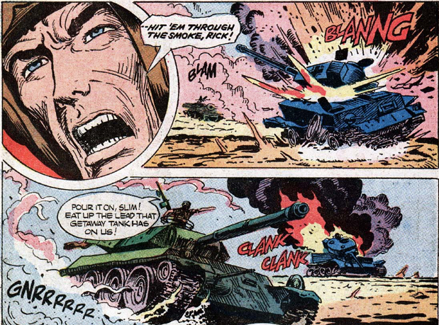 Peter: The crew of the Jeb Stuart are granted a rare bit of R’n’R and head for a nice little village in France. Unfortunately, Rick’s temper gets the best of him when a sweet French maiden takes advantage of his giving nature and he ends up wrecking half the town. The boys pay for the mess and hustle him back to the Haunted Tank before the M.P.s have their way. Shortly thereafter, the Jeb trades firepower with a Messerschmitt playing bodyguard to a Nazi tank. Once our heroes dispatch the plane, they tail the Panzer into a nearby village, where they win a nasty battle and discover why the Panzer had a big brother. On one of the dead soldiers, Rick discovers a fortune in diamonds, stolen by the Ratzis from their multitude of victims. Fantasizing a life better than the one he’s always led, he turns his guns on his comrades and exits stage left, diamonds in tow. Later, looking for a place to stash his booty, Rick encounters the Ghostly General that Jeb is always talking to and receives a stern warning: Rick can run, but there’s nowhere to hide! Sure enough, inside the farmhouse, he finds his comrades, bundled up and mid-interrogation by some angry Germans, attempting to reclaim their ill-gotten fortune. Using a bit of trickery, Rick manages to mow down the soldiers and free his friends, who have evidently forgotten Rick’s recent villainy.