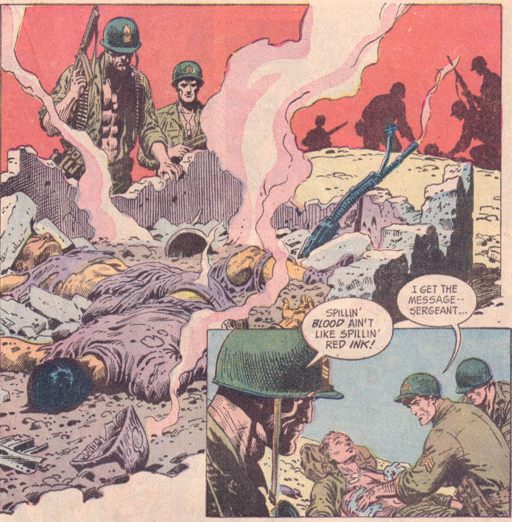 Kanigher and Heath combine to tell a stirring tale of one man's heroism, though I have to say it was a bit confusing the first time I read it. Russ Health's art is great, but I had a bit of difficulty distinguishing one sergeant from another when the bullets started to fly and, as a result, I had to read this one a couple of times before I realized that it was the other sergeants, and not Rock, who were making mistakes and that the sergeants whose lives he saved were probably the same ones who came and slept near him at night. At least, that's what I think was going on. Wordless sequences are great but it helps when the action is clear.