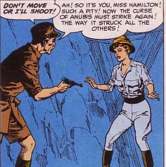 Ace reporter "Geri Hamilton" has been assigned to a story in Egypt, where a rash of deaths has crippled an archaeological expedition tasked with finding the tomb of Anubis. The great God's resting place has been found but the unearthing comes with a curse, one that has taken the lives of six men. Geri won't accept that an ancient curse is responsible so she does a little homework and discovers that her guide, Dr. Mannheim, served in the Afrika Korps and he and several of his comrades stole and buried half a million in gold in a mining tunnel next to the dig. Geri catches Mannheim in the act of retrieving his gold, but the cad threatens our girl's life. The intrepid reporter causes a cave-in, which saves her life and alerts the authorities. Another exclusive for the cutest newshound going! "Geri Hamilton" gets a slightly higher rating than the rest of the stories this issue because Reed Crandall looks like he hadn't received his pink slip yet and was creating art just like he always did, meticulously and stylishly. The story is hogwash, of course. I'm still not clear on whether Mannheim buried his gold and then stumbled on the Anubis tomb or vice versa but, in the end, it doesn't really matter.