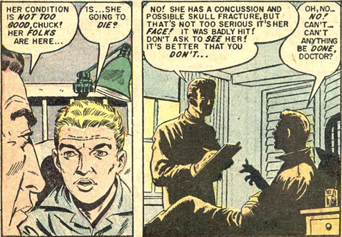 Nineteen year-old Marian has everything to live for. She's pretty, she's a straight-A student, mom and dad pay her bills, and handsome Chuck is about to pin her . . . with his frat pin! Out for a joy ride with Chuck, Sandy, and Harry, Marian has never felt so alive, until Harry floors it around a sharp bend and wraps his jalopy around a tree. Harry and Sandy are killed, Chuck is thrown clear and fractures his right arm, but Marian, oh, Marian. The poor girl has a compound comminuted bilateral fracture of the mandible, a deviated septum, a depression of the Malar-Process of the Zygoma in the infra-orbital region, and a fragment of bone missing from her right mandible. No amount of Max Factor is gonna clear this up. She needs several surgeries and she needs them pronto. Chuck comes to see her but she turns him away, not wanting her beau to make Quasimodo jokes. The doctors make no promises but three plastic surgeries later and the process of healing begins. After a mere two or three panels, Doctor Wilson proudly shoves a mirror in Marian's face (along with a bill for $3,000,000.00) and shows her what a little rebar, chicken wire, and chewing gum can do in the 20th Century. Our girl is all healed and just as pretty as ever and, on cue, Chuck enters the room after eight months of abstinence and pins Marian . . . with his frat pin!