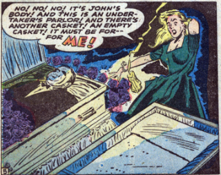 What's a girl to do when she's married to John, a fat, unromantic beast who demands she do the cleaning, the cooking, and the other stuff, but gives nothing in return? Well, if you're Rita, you crave the night and your dreams, which take you to the "Room of Shadows," a place where life is wonderful and filled with roses. Tired of living half a life, Rita talks her neighbor into murdering John and burying him in the basement. Unfortunately, after the dope splits John's heading two with a metal pipe, he gets cold feet and runs from the house. The police arrive and gun down Rita, who goes to a permanent "Room of Shadows." The climax is extremely vague (as Rita is bolting from the house, a newsboy is calling out headlines of the crime she's just committed!) and the art, by Mike Sekowsky, is ugly and amateurish but there are kernels of something imaginative lying in slumber in those first few pages.