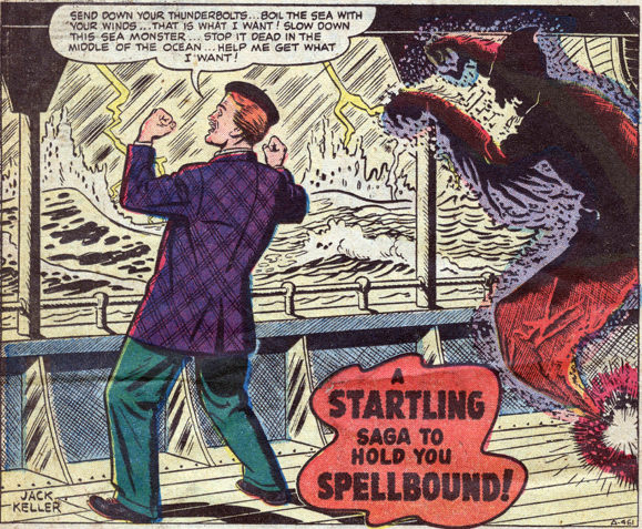 "The Old Mill" is another of the seminal stories that could be tagged as "The Beginning of the EC era at Atlas," as it has a wallop in its climax worthy of a Tale from the Crypt. Our narrator goes to work for the sadistic mill owner, Kurt Braun, who believes in taking a slice of hide for every dollar he pays. Initially willing to put up with the abuse to earn a wage, our man soon finds working for Herr Braun to be more than taxing... it could cost him his life. After Braun catches his worker mislabeling a bag of wheat, a fight ensues and the mill owner is killed. The next day, village men come to pick up sacks of flour and discover one labeled Kurt and one Braun. Our story teller has disappeared. Two milestones here: a gruesome death (albeit one handled off-screen and left to our imagination) and a killer who gets away. No swift justice doled out to the murderer. The mill owner's corpse doesn't rise from the sacks and reassemble to meet his killer on the moors as he escapes. Well, maybe that did happen after our climax. Who knows?
