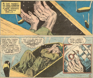 Peter: Why Big Bob feels the need to retell the Losers origin story is anyone's guess. If you put a gun to my head, I'd say it was to slam home the point that Kanigher was taking back the reins after a disastrous run by "The King." Though it's certainly more digestible than what Kirby wrought, Big Bob's script doesn't skimp on the outlandish. The parachuting coffins scene is ludicrous; there's no reason to take the subterfuge to such an extreme. Never mind the impossibility of activating your parachute while trapped in a coffin hurtling towards ground! Once the boys are out of sight of the traitor, they can go about their business in a much safer fashion. Are you telling me the pilot had no idea what was going on? Lehti seems to be flying solo here on this one (no Kubert trademarks that I can see) and, I have to say, the art is not half bad.