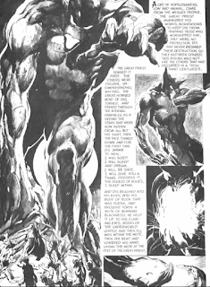 That's a half-assed synopsis, I know, but this story is very hard to follow and makes little sense. The story behind the story is that comic fan Harlan Ellison wanted to write a script based on a Frazetta cover and this is the one that landed in his lap. Neal Adams was then assigned to visualize Harlan's words (a natural choice, since Adams was coming off much acclaim for his stint on Deadman and was just about to revolutionize comics with Denny O'Neil on Green Lantern/Green Arrow). I liked writer Ellison's use of the seven stones but Dis's reappearance and the Stedman episode seem rushed, as if this was only a couple of chapters from an Ellison novella. I've never been a huge fan of Harlan's (a bit too pretentious for me); his reputation was built on some solid work in the 1950s and early '60s but the writer became more of a lightning rod for controversy afterwards. I'm not denying the man his talent, but that pretension I alluded to certainly shows through in "Rock God":