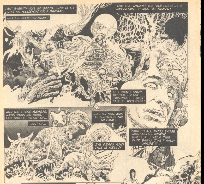 "The Hero Within" had a huge impact on me when I first read it in 1973. My 12-year-old brain was frazzled by the horrors this little boy had to endure, events that were in no way of his making. And then... no happy ending! This was a different kind of Warren story to me and, today, though the impact has dulled a bit and I can see a few flaws, the story is still pretty potent. Steve Skeates manages to shy away from the maudlin and get down to the business of telling a horrifying story, one that leaves us with a depressed feeling. This poor, innocent kid deserved so much more than a grisly death, but the impact of that climax stays within your brain for quite a while after you turn the final page and go back to vampires that walk around in business suits. Would I question the random involvement of Blonde Sonja now that I'm old enough to know better? Oh yeah, but I assume "big boobs" was something Rich Corben (who we sadly lost just a couple of weeks ago) had written into his contract with Warren.