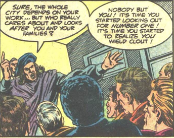 Jack: I realize that this is just an old, forgotten backup feature in a DC comic, but did it strike anyone else as eerie that the tale features a politician who is trying to appeal to blue collar workers by playing on their sense of victimhood and his motto is that he looks out for number one? Add to that an image of empty store shelves and 1983 is looking an awful lot like recent history.