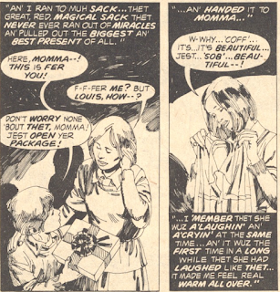 A cheery St. Nick story! Make no mistake, I like a sadistic, bloody Christmas story as much as the next guy (see "Bless Us, Father" in #59), but "The Greatest Christmas of All" is depressing, boring, and, worst of all, pointless. Would Santa's bag really contain a giant viper, even when opened by a drunken child-beater? I kept thinking, "If this bag is so magical, why doesn't Louis pull out an inhaler for his (all together now) dying mother?" And why does this story look like it takes place in the big city, but Louis speaks as though he's from Cripple Creek? Most of all, why does a good-hearted boy grow up to die so miserably? One too many magical bag stories for one issue.