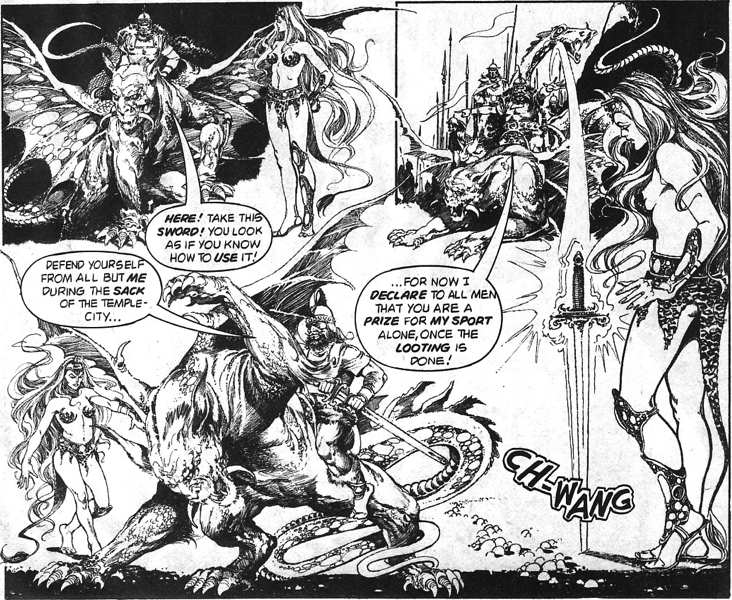 A barbarienne finds herself the only defense when a horde of warriors attack her city. There's a goofy twist at the climax (turns out the Red Sonya clone and all her city mates are but germs on a spaceship used to fuel the ship's engines), but essentially that 15-word synopsis is all you need for "The Quest." The message here, received loud and clear, is that Ramon Torrents is the new Esteban Maroto.