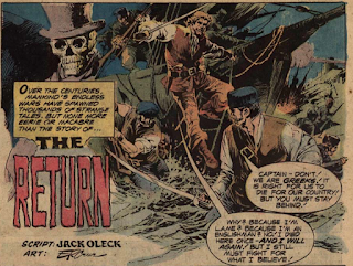Jack Oleck decides that mining the "prophesied death" twice in one issue is just fine but then forgets to write two engaging scripts to go with that hoary old chestnut. "The Return" finds George Gordon, a sea captain, fighting with Greek rebels against the Turkish cavalry. The Captain reveals to his men that he believes he died once before on Greek soil and will die here again but, naturally, the men dismiss such talk. As predicted, the captain does indeed die and his heart is buried on Greek soil. Our skeletal host reminds us that George Gordon was also the name of Lord Byron. How any of this ties together, I have no idea. Men with brave hearts or good imaginations are reincarnated throughout the ages? I guess so, but Oleck certainly could have whipped up a more interesting way of telling us than "The Return." But, as with "Born to Die," we're graced with nice art. E.R. Cruz contributes gorgeous, detailed images, so feel free to skip the words.