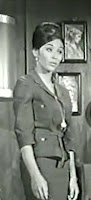 Baldwin points out that Ernest wears a different rose in his lapel each day and Baldwin's own beautiful secretary enters, demonstrating that this office is one where women are hired for their looks. The entire episode of "Crimson Witness" is almost like an episode of the much later TV series Mad Men in its depiction of the relations between the sexes in a big-city office in 1965. In any case, Baldwin tells Ernest that he is being replaced as plant manager by his brother Farnum. There is a cut to Ernest's home, where we see Farnum, overweight, balding, and sporting a walrus mustache, contrasted with Ernest, who is suave and handsome. Ernest's wife Judith is nonplussed when Ernest tells her that Farnum is replacing him at work; poor Ernest can't even get the best of his brother physically, as he learns when he tries to throw his long-term house guest out and instead ends up on the floor himself.