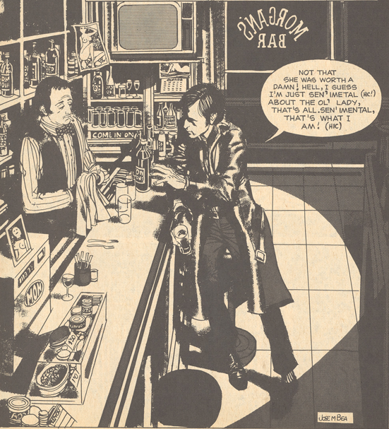 A stunner, "Like a Phone Booth, Long and Narrow" is, as I recall, the first time I became aware of the power of Jose Bea. It was his first appearance outside Vampirella (a title I did not purchase at the time, since horror stories about girls were yeccchhhy) and, even at the age of ten, I thought this art was scary. You could say there might have been more elegant or clean pencillers around the Warren building (Wood, Crandall, and Gonzalez come to mind), but scary? Nope. Tom Sutton and Pat Boyette had unnerving styles, but they showed you all the horrors; Bea hinted at what might be terrifying in all those long, dark hallways and still creeped you out. For a designer to have that effect on a pre-teen, without showing the boogeyman, is quite an achievement.