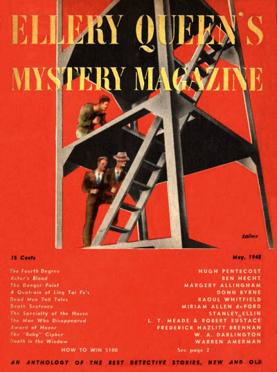 "Death Sentence," by Miriam Allen de Ford, was published in the May 1948 issue of Ellery Queen's Mystery Magazine. The author plants clues from the first line of the story as to what will happen, but it is not until the final line that she reveals the truth and the reader understands her misdirection. The story begins: "From the moment that Al Ravenel came back into his life, Norman Frayne had known that death was the only solution of the problem." Later in the story, she writes that "It was obvious that his secret would never be safe while he and Ravenel were both alive." Al found Norman because Norman had been in New York on a business trip when he encountered the head of the orphanage where they had both grown up, and the man had gone home to spread the word that one of the boys had become a success. When Norman tells Al, "'I'll never be safe while we're both on earth,'" Al responds that "'You haven't the guts to kill a mosquito, let alone a man.'" The narrator adds that, "In that instant, from the utter depths of despair, Norman Frayne knew what he must do." Once Norman makes up his mind to act, he concludes that, "for Paula's sake it had to be... an accident." The story's final line reveals that Norman, not Al, is dead, and that he committed suicide. The "Death Sentence" of the title was rendered when Al arrived in town.