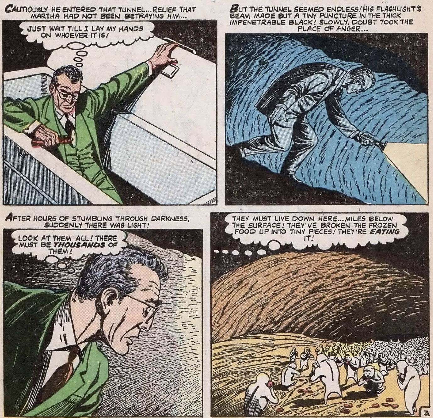 Henry climbs in and discovers a long passageway down into the Earth (walking through pitch black, I should add!), where he stumbles upon a race of small critters eating his vittles. They spy the intruder but, rather than drop their spare ribs and munch on Henry, the creatures telepathically thank their benefactor for his "donations" and urge him to stay. Henry agrees but adds that he must first take care of a few things up on the surface.