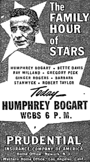 John and Gwen Bagni wrote a radio play called "Mink Gloves" that aired on December 5, 1948, on The Prudential Family Hour of Stars. The show starred Humphrey Bogart as a down-on-his-luck fight manager who sits in a bar and tells the story of how he saved the career of Johnny Richards, "the greatest middleweight in the racket," and wrecked his own career in the process. Nick buys Johnny's girlfriend, Georgia, a mink coat to get her to talk Johnny out of throwing a fight; the gloves of the title are boxing gloves. The show is lost but the script is in Gwen Bagni's papers at UCLA. (Thanks to Maxwell Zupke at UCLA Special Collections for providing a copy of this rare radio script.) "Mink Gloves" has nothing to do with the TV show "Mink" that aired on Alfred Hitchcock Presents; Bagni wrote the original teleplay with Irwin Gielgud, whom she married in 1955, the year after John Bagni died.